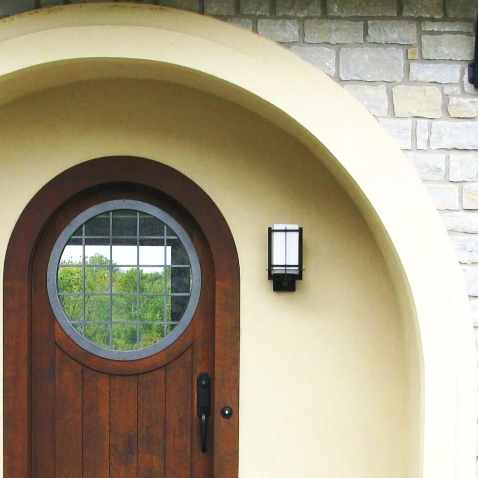 Brown County stone, used in parts of the original house, is used for the columns and base of the screened porch. The porch is set at an angle to the house, forming a sheltered area for the south-facing patio with low walls and steps for seating.